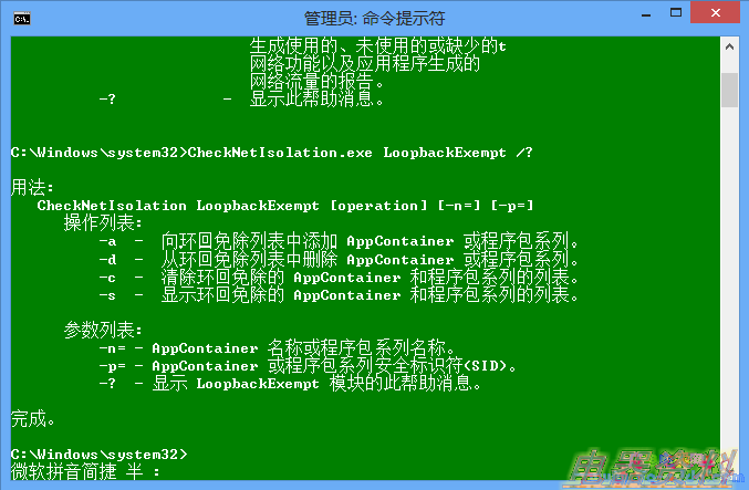 要删除某个豁免,将添加豁免的命令中的 -a 参数换为 -d 即可,要快速全部清除列表内容,执行"CheckNetIsolation.exe LoopbackExempt -c"。
