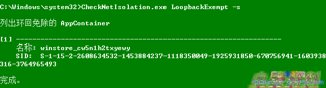 要验证豁免列表,我们使用"CheckNetIsolation.exe LoopbackExempt -a -s"命令即可: