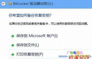 恢复密钥是确保我们在丢失凭证(密码或智能卡)时,使用一串字符来解锁加密驱动器。这个恢复密钥我们可以保存在我们win8的Mrot账号中,可以保存成TXT文件,可以直接打印出来。值得注意的是保存到Microsoft账户这一途径,需要注意的是如果是域账户时没有这个选项的。在选了该项后待保存完成后,我们还可以再次保存成TXT文件,或者直接打印出来,待备份完成后,点击下一步即可。
