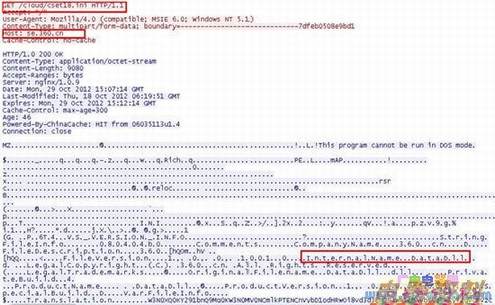 1)预留后门,植入代码:一些浏览器在使用过程中会在用户不知情的情况下在后台执行《安装许可协议》规定内容之外的功能,360安全浏览器在运行过程中约每5分钟与服务端进行一次通信,并下载一个文件,如下图所示,下载的文件为se.360.cn/cloud/cset18.ini,但是从数据流可以看出该文件实际上是一个PE文件,文件头中标识的产品名称为DataDll。