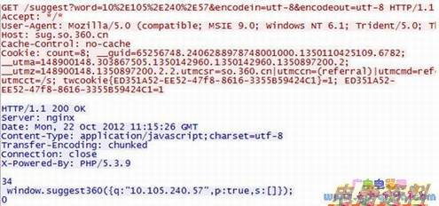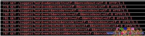 下图所示为当用户在360安全浏览器5.0的地址栏中输入“weibo.com”的过程中,每输入一个字符,浏览器就会向 sug.so.360.cn发送当前浏览器地址栏中的内容(即“w”、“we”、“wei”、“weib”、“weibo”、“weibo。”、 “weibo.c”、“weibo.co”、“weibo.com”)。