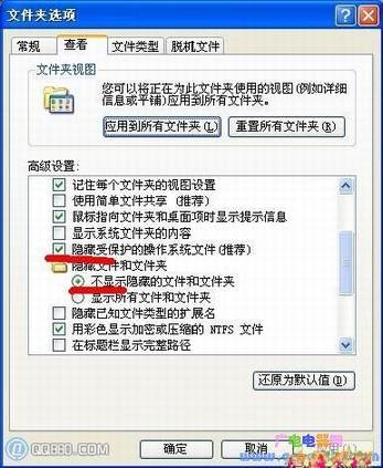去掉“隐藏受保护的操作系统文件”前的对勾,点选“显示所有文件和文件夹”,再单击对话框下面的“确定”按钮,原来U盘中莫名其妙地丢失了的文件夹就会显现出来。如下图,划红线的即是原来的文件夹。