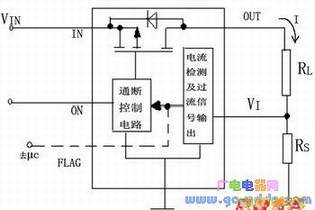 图2是一种带过流保护的负载开关结构框图,图2中,RL是负载,RS是电流检测电阻.流过RS的电压降VRS与电流I成比例,此电压VRS输入负载开关VI端.若内部电流检测电路检测出有过流状态,输出过流信号(信号)给通、断控制电路,关断负载开关.一旦开关断开,RS上电压VRS=0,开关又接通,产生振荡,如图3所示.输出电流将小于限制电流.更好的办法是通过FLAG端输出过流信号给μC,使μC输出低电平给负载开关ON端,关断负载开关.图2中未画出μC及μC与负载开关的连线.