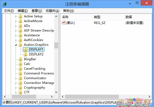 1. 前往注册表 HKCU\tware\Mrosoft\Avalon.Graphics,在下面,有几台显示器一般就会有多少个键,分别命名为 DISPLAY1, DISPLAY2, …, DISPLAYn. 我们需要做的,是点击到每一个 DISPLAYx 的键上面,在右侧删除所有的键值(键值"默认"除外)。正常的未进行 ClearType 调谐的样子应该是这样的: