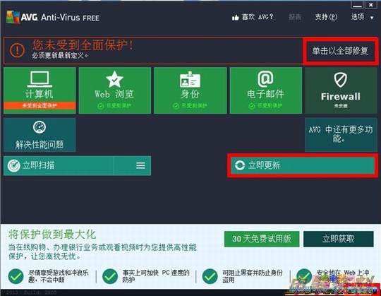 第一眼看到AVG的时候有没有感觉和Win8上的Windows UI很像?新的UI使得一切操作都一目了然,可以大大提高操作的效率和准确性。AVG安装完成之后,第一次使用前记得要更新下最新的病毒库,如果不喜欢最下面的产品试用光棍,可以点击右下角很隐蔽的“隐藏通知”的按钮。