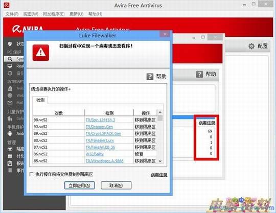和AVG一样,小红伞在压缩包解压的时候也没有报毒,当进行扫描的时候共检测到了69个,成绩也还不错。