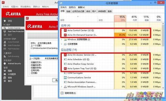 除了查杀率,相信用户最关心的就是杀毒软件对系统资源的占用了,下面我们就来看下这四款软件的资源占用情况。四款软件在扫描时,avast!的内存占用是最低的,只有20M多一点,;而AVG的内存占用也只是比avast!略高一点,不到50M。相比之下小红伞的内
