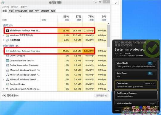 存占用就有点高了,有160M左右,但是想到毕竟不是经常进行全盘扫描,而现在新的电脑的配置都不低,因此160M的内存占用也还可以接受。文中介绍的Bitdefender虽然是其免费版本,但是在简洁的外表之下确实一颗大心脏,对于BD这款重型杀软来说,扫描时110M的内存占用实在是不算高。
