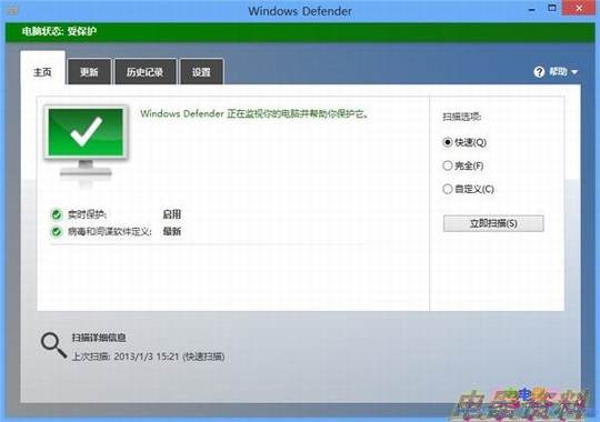 首先就是Windows Defender的界面,传承自MSE的界面既不像Bitdefender免费版那样简洁到让用户有些无所适从,又不会太复杂让人眼花缭乱,可以给用户一个十分简洁明了的使用体验。