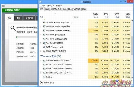最后再看一下全盘扫描时Windows Defender的资源占用吧,内存占用只有60M左右,绝对是一款高效的杀毒软件。