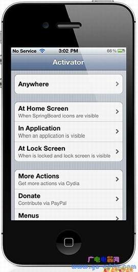 Activator是一个非常强大的辅助工具,它自带了种类繁多的功能设置,你可以通过手势(如双击状态栏、晃动设备等)来触发特定事件(如模 拟Home键、打开多任务管理器等)。难能可贵的是,有非常多的工具与Activator相兼容,善加利用搭配众多的工具才能使它发挥出最大的功 效。该插件完美支持所有iOS设备,可在BigBoss源免费下载。