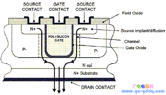 在它上面要生长了一层n-epi,并制成了两个连续的扩散区,p区中合适的偏置将产生沟道,而在它里面扩散出的n+区定义了源极.下一步,在形成磷掺杂多晶硅之后,要生长薄的高品质栅极氧化层,从而形成栅极.要在定义源极和栅电极的顶层上开接触窗口,与此同时,整个晶圆的底层使漏极接触.由于在栅极上没有偏置,n+源和n漏被p区分隔,并且没有电流流过(三极管被关闭).