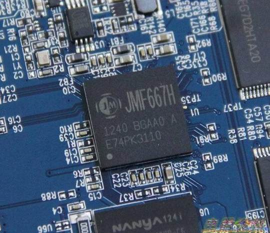 针对JMF616的不足,Jmicro后来推出了性能更强的JMF667H主控方案。它是JMicron首款支持SATA 6Gbps接口主控,台积电55nm工艺制造,内核架构自然是ARM,数据交换可以绕过CPU而直接通过通道高速进行,支持八信道,持续读写速度分别可达500/400 MB/s。不过,JMF667H的随机读写能力比较低,这也是JMicron主控一直的缺点,不过由于价格低而为二、三线SSD品牌中低端SSD产品所采用。比如影驰GT128GB Pro SSD就是采用此主控芯片。