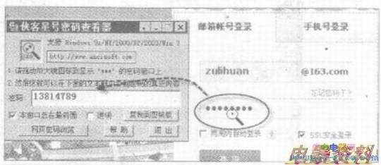 如果用户在“Intemet选项设置”中勾选了“自动完成设置”,这样打开论坛、Web邮箱登录页面后,输入用户名,会自动填入密码,不过这些密码是以星号形式出现的,以1 63邮箱登录页面为例,打开1 63登录页面,输入用户名,自动填入密码后,运行“侠客星号密码查看器”,把软件界面中的“放大镜”拖至星号位置,则在软件的“密码”框中会显示出真正的密码(如下图)。