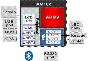 在工业应用中,通常将 PRU 配置为 IO 块,用来顶替处理器未能提供的 IO。例如,它可以用在需要 UART 块组合的便携式数据终端中,用来连接 GSM、GPS 与蓝牙 (Bluetooth)、小键盘、打印机、LED 组以及 RS232 端口。然而,虽然该处理器系列中的最佳选择只集成了三个 UART,但 PRU 可提供更多的 UART 接口,可充分满足不断发展的终端设备对处理各种功能的需求。