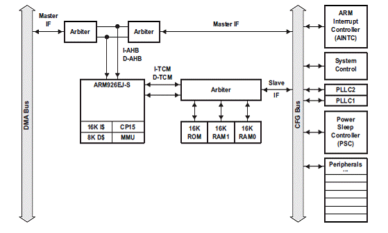 对于 USB、EMAC、SATA、uPP 以及 PRU 等外设而言,ARM 子系统可访问外设的控制与配置寄存器、时钟以及电源管理控制。