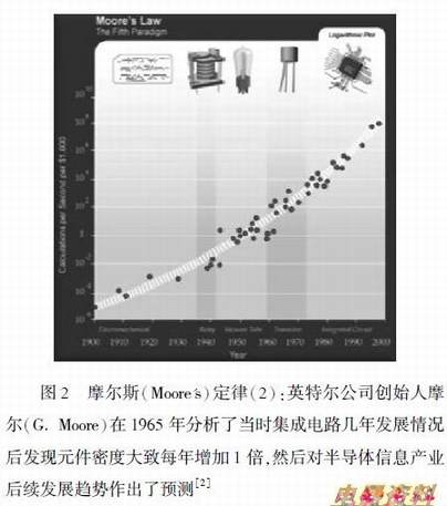 这个行业的发展在发明后的半个多世纪来基本上遵循了英特尔(Intel)公司创始人摩尔(G.Moore)在1965 年作的一项预测:集成元件密度大致每年增加一倍(图2)。而这种近指数式的发展趋势主要归功于平面集成式的整体制造(BatchFabration)工艺,系统中(如等)的元部件(如三极管)不再是用传统的零件加工组装模式制作,而是整体制作完成。这样,在制造工艺和精度不断提高的同时,人们就可以在同样单位面积里放置越来越多的,这样就带来了功能的不断提高和成本的不断降低。