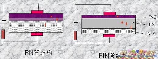 PIN管的结构:在P型半导体和N型半导体之间夹着一层本征半导体。因为本征层相对于P区和N区是高阻区这样,PN结的内电场就基本上全集中于 I 层中。
