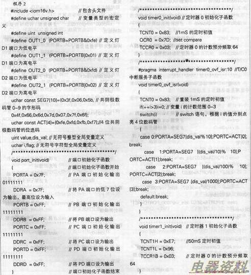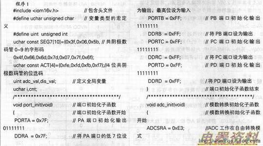 ATMEAG16L的模/数转换器编程实践1.简易数字式o~5v直流电压表实验用电位器RV1作模拟量的输入,右边4位显示输入电压值。我们使用PA端口的第7位进行模拟量输入,而PA端口的第O—6位作数码管的段驱动,这样,显示的数字中小数点不能被点亮。因此,“千”位数码管相当于显示整数,而“个”、“十”、“百”位数码管相当于显示小数,例如: