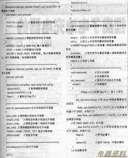 的双排针的上面7位也应插上短路块(最下面1位不要2.“窗口”电压识别与控制实验在自动化控制中,有些设备需要在一定的条件下工作。超出此条件后,可以控制设备停机,也可以发出报警信号。现在我们使用ATmega16L单片机的ADC模块实现输入模拟量的监控,输入电压小于2.OOOV时灯D1点亮报警,输入电压大干插短路块)。我们用一枝小螺丝刀(或电笔)调节电位器RV1,改变输入的模拟电压,我们可看到数码管的显示从0000~5000(相当于o.000—5.ooov)会变化。