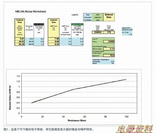 如果知道或可以估计出一款低放大器的增益或噪声带宽,只使用几只和一只交流表,就可以测出其它的参数。本例使用了Johnson方程,它描述的是一只所生成的噪声量。要找到缺失的参数,就要测量放大器的输出噪声电压,此时,先将输入短接,然后使用几只不同值的。可以从网上下载一个Excel电子表,用于计算增益或噪声带宽。