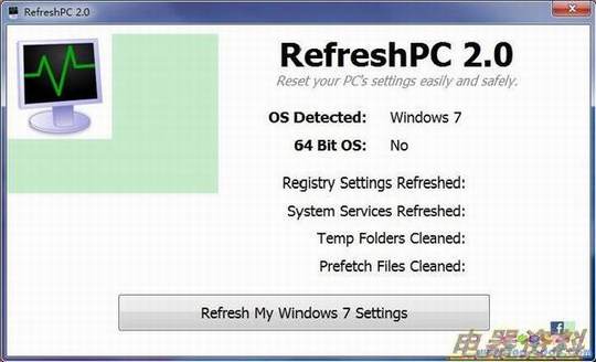 首先将RefreshPC安装到自己的笔记本中(下载地址:http://www.pcw.com/bzt),然后点击“Refresh My Windows 7 Settings”的按钮,就开始将将注册表、服务、临时文件、超级预读取文件恢复到初始状态,支持全系列的 Windows XP、Vista 与 Windows 7,新版也支持 Windows 8 快速重置。