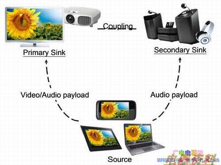 在Miracast无线显示标准中,将设备分为两类,一类称为传送端,另一类称为接收端。接收端又分为主接收端及次接收端,差别在于主接收端支持视频或声音数据的接收;而次接收端只支持声音的数据接收,这样用户就可以选择将视频、音频分流至不同设备并同时呈现出来。