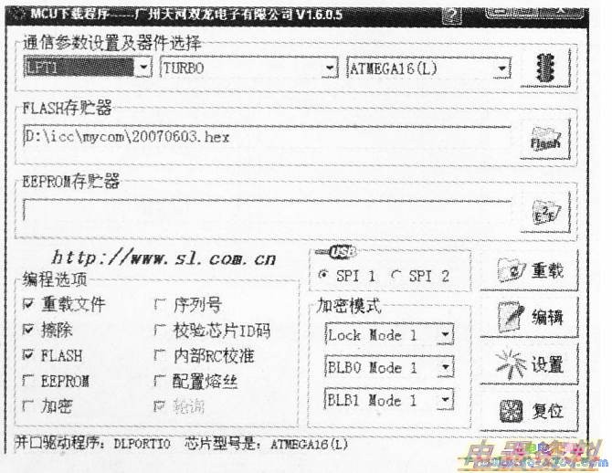 首先把AT89C51的20脚与atmegal6的GND脚连接起来,保证地线一致。AT89C51的18脚引出线与atmegal6的XTAL1脚引出线做好短接准备。给atmegal6实验板上电,AT89C51自制实用电路板上电(注意:AT89C51的18脚引出线与atmegal6的XTALI脚引出线未短接)。打开双龙电子的编程软件,界面如下图所示。