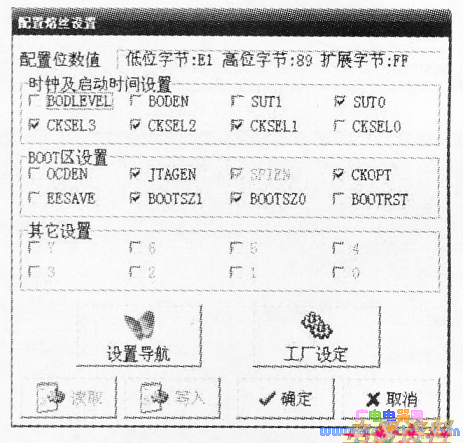 注意上面的选项,SUTO,CKSEL3,CKSEL2,CKSEL1,EN,CKOPT,BOOTSZ1,BOOTSZ0必须打勾,其它的不能打勾。这时可以短接AT89C5l的18脚引出线与atmegal6的XTALI脚引出线。点击写入,可以看到写入成功的提示,把短接线断开,atmegal6实验板恢复了编程功能,又可以进行新的开发工作了。