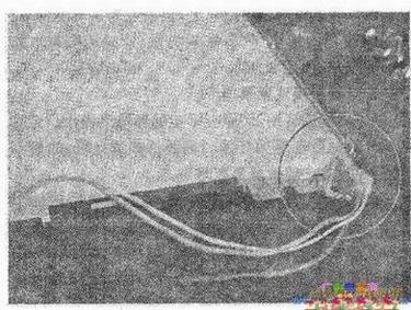 (2)将液晶板与机内所有的连线插头都拔开,然后在操作台上铺放一张柔软的垫子,最好是防静电的橡胶垫,如果没有也可以采用纯棉布垫,不要采用化学合成材料的纺织品,那样会产生静电。检查垫子上面没有异物以后,将液晶平面向下放置在垫子上,推开固定灯架的卡扣,慢慢拉灯管电缆线,将灯管单元取出,如下图所示。
