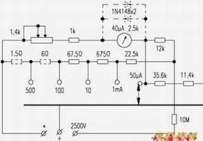 该表所附图中,表头应有两只保护二极管,但实际并未装上,故在使用中表头线圈易被烧坏。加装保护二极管并不难,按附图虚线所示加装即可,二极管可用1N4148型的。