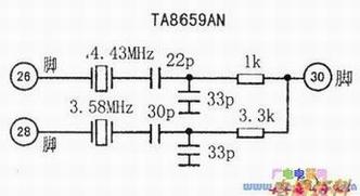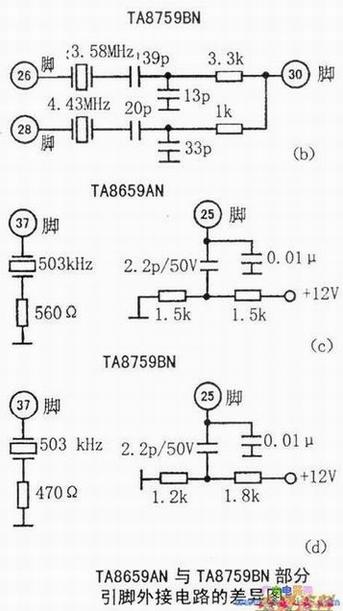 TA8759BN与TA8659AN功能完全相同,但其(26)脚与(28)脚4.43M与3.58MHz输入方式不同。故两者互换时,须根据下图对外围电路进行变换。