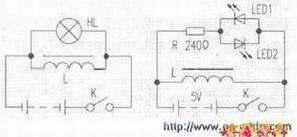 电工基础现象实验图见图1,接通电路使灯HL正常发光后,再断开电路,这时可以看到,断电的一瞬间,灯泡突然发出很强的亮光(笔者用量不同的做了多次实验,观察效果都不好),然后才熄灭。