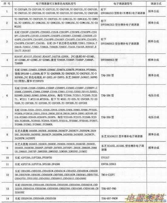 在彩色电视机中,许多机型内使用的电子器,采用同一型号或可互换的型号,知道了这些电子调谐器可互换的彩色电视机的型号,对选用或代换电子调谐器是很有用的。 下表列出了部分电子调谐器可互换的彩色电视机型号,供参考。