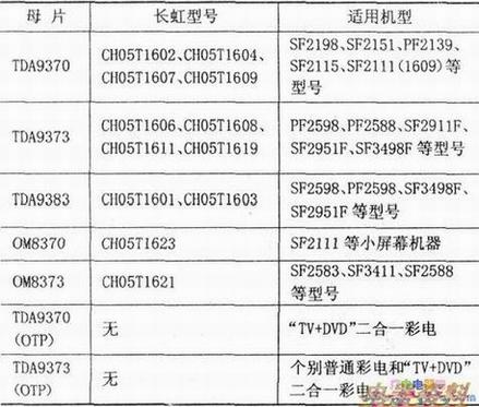 一般地,在超级单片IC的包装上都同时标注有“母片”型号和“长虹”型号。如:TDA9383P2CH05T1601。代换时,先确认母片型号。