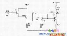 信号转换的原理是:Vin在三极营T1上产生电流1,在三极管T2上产生电流Ic2,Ic2正比于Ic1和Vin,Ic2又通过R4产生压降,正比于lc20结果是,R4上的压降正比于Vin值。再根据Vh与Vin逻辑相同,V1与R4压降逻辑相反,可以得出:Vh高,V1低;Vh低,V1高、Vh逻辑与V1相反。