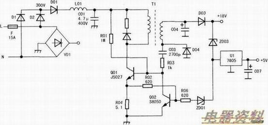 电磁炉低压如图所示。220V交流电经D1、D2与主电路整流桥VD1内左半桥整流后变为直流,再经C01,得到300V直流加至开关管Q01(J5027)集电极,该电压还经启动R01(1MΩ)加至Q01基极,使之导通。开关T1副边感应出上负下正的电压。经正反馈电路C03(2700pF)、R03(1kΩ)加到开关管基极,使开关管饱和导通。随着c03充电减小,开关管退出饱和,进入截止状态,T1副边感应出上正下负电压(将磁场能转变为电能),经D04整流、c04滤波,得到+18V电压,此电压除供给驱动电路外,还要为U1(7805)供电。若将其直接接到U1(1)脚,会使U1功耗过大。为此+18V经D03降压,得到8V电压供给U1。Q02(S8050)兼具稳压和管作用。