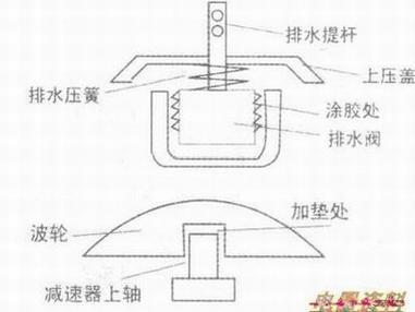 对原因(1)、(4)只要更换相同或相近的排水阀门(或胶圈)和排水簧就可以解决,需要注意的是,在给单缸和中后期产品更换排水阀时,要在下图标示处涂一些密封胶,防止水从此处经排水提杆外漏;对原因(2)要适当调整排水拉线,调整时需注意,若排水拉线过紧.拧排水开关时吃力且易拉断排水拉线;过松则排水不利(能把排水阀提起1cm为最佳);对原因(3)则需清除排水通道,并适当凋整排水拉线(如果排水提杆断短了.可用铁丝做细钩,只要能提起排水阀仍可使用)。
