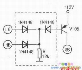 为此,专门设计了一款U频段电压转换,只需将V105的基极从原电路中脱开,然后接入如下图所示的电路中(虚线方框内为添加的元件),进行自动搜索,高频头三频段电压变化正常,本地电视台均能被搜索存储,且图声俱佳。