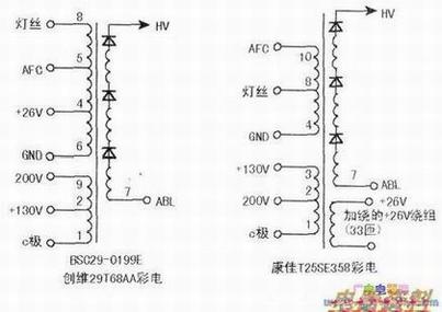 先取下坏高压包,经检测其⑦脚外接的ABLC322(0.5611F/250V)已炸裂,其他未见异常。此高压包因无法购到,于是考虑代换。现有一块25英寸康佳彩电的废板,超级单芯片型号是KONKA—CKP13028829CPNG5FF7,与此机相似。两只行变的绕组简图如图所示,对比发现康佳机的彩行只缺少场部分的26V供电,因康佳机场块用的是LA78041,并且场供电取自于,所以此机高压包无场供电绕组,其他电路相同,但行变引脚位置略为有差异。
