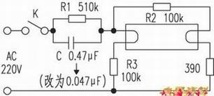 分析原因是灯管工作太大所致。该灯如附图所示。小灯管降压限流用的器C的容量为0.47μF,经实验,即使C用0.01μF时亦能发亮,只是亮度较暗。若要兼顾亮度和睡眠时眼睛对光线的舒适度,取C为0.047μF较为适宜。