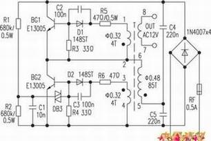 5.若以上元件正常,变压器仍无输出,应测BG1、BG2基极振荡回路R5、R6、R3、R4是否正常;C2、C3是否失效或变质,D1、D3是否损坏。