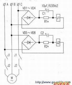 如图所示。J1、J2是两个380V的直流,当A相缺失时.J2不吸合;当C相缺失时,J1不吸合;当B相缺失时,Jl和J2都不吸合,此时风扇都不能得电。为了防止开机时正常,使用时缺相.(缺相的那根线上有经电动机线圈降压后返回的另一)而使Jl或J2不能释放(继电器的特性决定了其释放远远低于启动吸合电压).所以在Jl和J2的线圈上串联了一个阻容回路。原理是:开机瞬间,可流过充电电流,Jl和J2能可靠吸合。随后,充满了电无充电电流,上就产生了压降,Jl和J2就在较低的电压下维持吸合。缺相时,由于电动机返回的电压已低于继电器的维持吸合电压.Jl或J2释放,电扇得到保护。