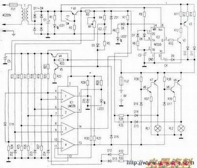 时基电路NE555构成脉冲充电驱动功率器件的基准脉冲源。由④脚控制。四电压比较电路LM339则用来应变交流断电、电池充电、应急照明控制、故障指示等自动检测的控制与否。主要完成下列一些功能:1.在交流主电源具有220V供电情况下,提供直流约14V电源给脉冲/浮充充电电路;提供直流9V给直流辅助电源作延时启动和应急照明控制,充电,故障自动检测电路作应变参考电压等。2.在有交流主电源的情况下,应急照明灯维持熄灭状态。而在失去交流主电源(断电)时,应急照明灯能即时点亮。3.在应急灯电气线路、元器件损坏时。橙色“故障”灯指示报警。4.正常运行时可通过“试验”按键自检应急照明功能(按下SW,V1截止,类似电源断电,应急照明灯亮)。5.安装有备用电池的应急照明灯具在库存期间,照明灯应该维持在熄灭状态。电池放电呈最低消耗状态。
