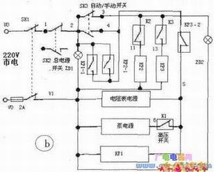 图中,合上SK1,按下“总开关”SK2.其常开触点1、2接通,市电(U0)经SKI到1号节点,(V0)到Vl节点,指示灯ZD1得电发光指示;此时,因为自动,手动开关SK3未按下,其常开触点2、3未能接通,其常闭触点2、4保持接通状态。由于节点3处于电气断开状态,而继电器KP2、KP3皆受控于节点3,故继电器KP2、KP3皆不能工作(见下图b),此时继电器KP3的常闭触点(KP3-2)保持接通状态,则表、继电器KP1得电工作,继电器KP1工作将其常开触点闭合短路2、4节点(继电器KP1此时工作是多余的)。表得电工作显示出水值: