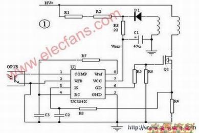 用UC3842做的的典型见图1.过载和短路保护,一般是通过在开关管的源极串一个(R4),把信号送到3842的第3脚来实现保护。当过载时,3842保护动作,使占空比减小,输出降低,3842的供电电压Vaux也跟着降低,当低到3842不能工作时,整个电路关闭,然后靠R1、R2开始下一次启动过程.这被称为“打嗝”式(hiup)保护。
