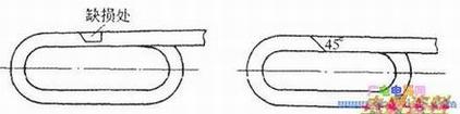 电动机单层边绕组一般在大型电机上使用,导线截面较大,匝数少。小面积匝阔短路时,可用薄锯片划掉短路点绝缘,剪一小块环氧玻璃布板,蘸上环氧树脂后塞入修补部位,固化后,即可投入使用。对匝间短路引起的导条缺损,可按下图方法修补。修补时注意补材和原导条都应打出坡口,以确保后电气性能。对应时对缝应与导线方向至少成45°。