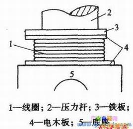 ⑤再如下图将线圈置于液压机压力杆下,轻加压力,通电使线圈快速升至155℃,并将线圈压至略小于原尺寸,约lh停电冷却后卸下,剔掉多余绝缘,在线头重新挂锡。
