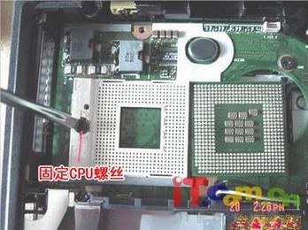 图拉丁P4 1.8G的CPU,哪个螺钉可以用一字螺丝刀自行的把CPU拆下来,最高可以升级到2.0G以上,但是笔者不建议客户自己自行升级,最好找些专业的维修站咨询一下