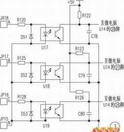 缺相及管路过/欠压保护电路如图3。A相从主板JP18端输入,经R120降压,使光耦U17的{1}、{2}脚得到正向电压。从而使U17的{5}脚变为低电平,与之相连的D14{28}脚正常工作时应为低电平3V。从而使微电脑检测到A相正常。B相串接于制冷管路欠压检测开关L-PRO的两端后,输入到主板的JP17端,U18的{1}、{2}脚得到正向电压后,使U14的{27}脚得到一个3V低电平,检测到管路过压开关及B相电源正常。C相串接于制冷管路过压检测开关H-PRO两端后,输入到主板的JP16端。使U19的{5}脚及与之对应相连的U14{26}脚得到一个3V低电平。从而使微电脑检测到C相及管路过压保护开关正常(当系统内压力低于0.05MPa时欠压检测开关断开。当高压管压力高于3.3MPa时过压检测开关断开)。检修时测量的关键点为U14的{28}、{27}、{26}脚,相对于A、B、C相。正常工作时3个脚的电压均为3V,高于3.8V时保护电路动作(如有缺相保护电路也动作)。此时可测JP18、JP17、JP16与零线输入端的JP15之间有无AC 220V电压。如正常可查各光耦{1}、{2}脚有无1.5V电压;{5}脚正5V供电电压是否正常。